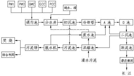 廢水處理過程:從PM1、PM2、OMC、GCC、PCC出來的車間廢水首先進入調勻池,對各個車間的廢水進行充分的混合,而且還可以起到調節作用,防止廢水沖擊負荷;進入分水井后,對濃度高的廢水使用純水或清水進行調質處理,降低廢水濃度,避免高濃度的廢水對生物處理系統造成危害;廢水進入初沉池首先可以去除廢水中容易沉降的大顆粒污染物;由于車間的廢水溫度較高對生化不利,所以經過冷卻水塔可以將廢水的溫度降到合適生化的溫度;經過沉淀處理后的廢水和回流污泥同時流入A池進行厭氧反應,待停留一段時間后再流入O池內氧化,由于微生物在厭氧和好氧的狀態下交替操作,可以篩選及馴化脫磷菌種,發揮脫磷功能。同時微生物可利用BOD當作有機源,也可以發揮一部分脫氮功能;經過處理的廢水進入二沉池,沉淀后上清液體進入放流池,采用潛沒排放,處理達標的水直接放入長江;污泥經過濃縮、脫水,然后進行焚燒和綜合利用。