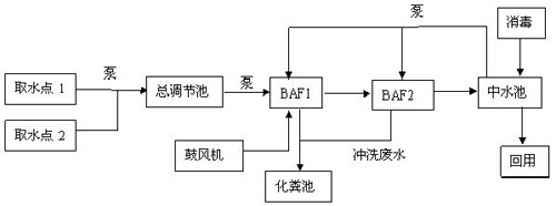 根據回用水質要求的不同組合成不同的工藝流程,其中的一種較簡單的工藝流程如下:
