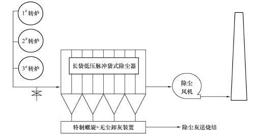 每座轉爐的含塵煙氣分別由二次煙塵爐前罩兩側的支管抽出,同時爐后設吸塵罩,爐前、爐后捕集的含塵煙氣在爐后匯合后進入干管,三座轉爐的煙氣在爐后最后匯合進入總管,接至長袋低壓脈沖袋式除塵器,凈化后的氣體經風機由煙囪排至大氣,除塵器收集下的含鐵粉塵由汽車定期送到燒結廠再利用。