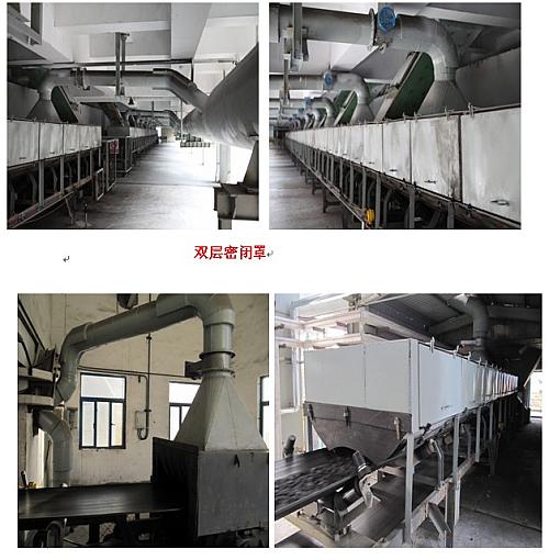 四、雙層密閉罩——(專利號ZL 01 2 51620.1;專利號ZL 01 2 51621.X)二層膠帶機受料點處密閉均采用我公司專利產品,它具有密閉效果好,控塵能力強,所需風量小,內罩走料,外罩走風,節省風量,結構簡單,便于拆卸,不影響生產操作及維護等特點;管路系統每個抽風點安裝有風量調節閥,保證每一點有足夠的風量。