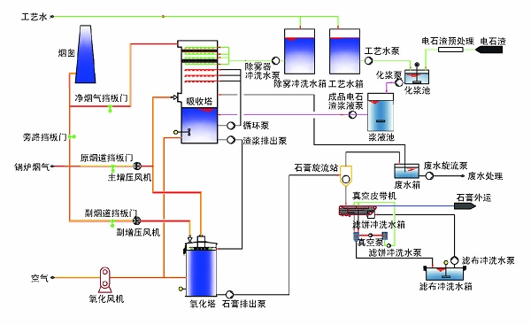 電石渣法是將電石法制乙炔工藝中產生的電石渣及其清液用作脫硫劑,其吸收工藝流程與石灰石—石膏法相似。該工藝不會產生溫室氣體—二氧化碳,是一個“以廢治廢”、電石渣無害化和資源化綜合利用的環境友好型工藝。由于電石渣本身是固體廢棄物,相比較于石灰石,其價格低廉、脫硫活性較高,因此所需的液氣比較低,相應的運行費用也明顯降低。