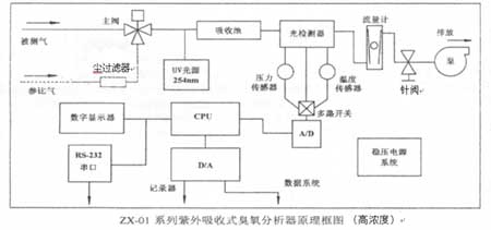 儀器為單光路結構,待測氣與參比氣經聚四氟乙烯電磁閥依次切換到同一測量池中,紫外光在吸收池中被待測氣體中的臭氧吸收。吸收值的大小由光電器件轉變為電信號,經前置放大器放大,A/D并由CPU計算出臭氧濃度。儀器的電路部分包括A/D、VFD顯示及D/A以及RS-232串行接口。顯示器可以顯示當前值、報警值、 溫度和壓力的數值,以及儀器的可選參數,如吸收系數,零點偏置值、平均周期時間等。此外,還能顯示儀器的自檢功能和故障自診斷功能。儀器的采樣、計算、線性校正、主閥控制等均由CPU按固化的程序自動進行。
