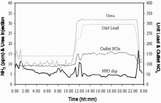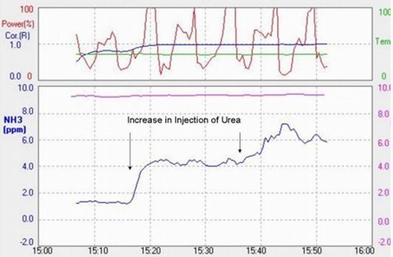 圖3包括了氨氣逃逸、尿素注入、NOX排放及鍋爐總負荷的曲線走勢。顯示了隨鍋爐負荷改變而變化的相應參數信息。當大約在11:00am鍋爐負荷發生變化時(負荷增加),尿素注射量也隨之增加,結果出現了兩次氨逃逸的峰值:在第一次峰值出現時,NOX排放維持在一個低水平,這與當初預計NOX排放會隨鍋爐負荷的增加而增加是不同的,峰值之后的氨逃逸量變化與NOX排放量變化趨勢出現了相一致情況;第二次氨逃逸峰值出現與NOX排放量增加是完全趨勢一致的,這兩個峰值的情況似乎與負載的一個小平穩期有關。當鍋爐負荷再次降低時,類似的氨逃逸峰值出現在大約23:00,其他的峰值如在0:00,02:00和08:00,這些氨逃逸量的波動與尿素注入率都存在相互關聯性。總的來說,在鍋爐低負荷期間,過量注入尿素導致了氨逃逸量的增加。
