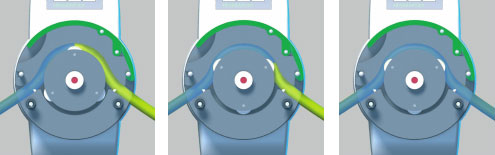 膠管是蠕動泵唯一的接液要件,泵是通過滾輪或者壓塊擠壓膠管來工作的。這就意味著泵可以干轉、自吸以及處理高私度、高磨損性介質。另外,膠管作為一個獨立的單位,使得泵體無需密封,因此它是完全無泄漏,非常衛生的。并且每一次旋轉都輸出一個固定的流量,這使得蠕動泵在定量加料的應用上有杰出的表現。這個原理可適用于所有的蠕動泵,那么泵頭和驅動部分就是區別蠕動泵品質的最重要因素。
