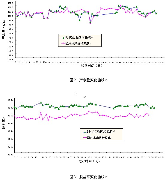 1)時代匯通抗污染膜元件現場的工程應用中無論在初始水通量及脫鹽率方面,還是在抗污染性能方面都有優異的表現,并在脫鹽率方面明顯由于國外品牌同類膜元件,證明了其通過改性抗污染能力大大提高,同時具有很好的初始性能及性能的穩定性。
