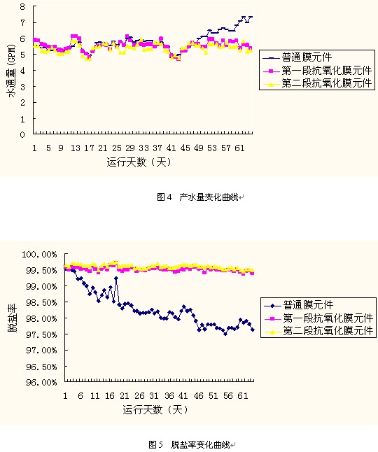2)時代匯通抗氧化膜元件在中試中證明其耐氧化性尤其對余氯的耐受能力得到了明顯的提高,進水余氯的存在為抑制微生物污染提供了更好的解決辦法,耐氧化膜元件的成功應用會有效的降低污染水源條件下反滲透系統的成本費用、運行費用及維護費用,優化反滲透系統設計,進一步拓寬反滲透膜的應用領域。
