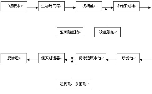 首先通過生物曝氣塔對二級廢水進行好氧生物處理,達到降低廢水COD的目的,沉淀池出水投加次氯酸鈉進行殺菌,經過纖維束過濾和砂濾池去除懸浮物后進入反滲透原水池,原水池中保持0.2ppm左右的余氯濃度,以達到持續殺菌的效果。由于傳統的聚酰胺復合反滲透膜元件對氧化性物質的耐受性很差,往往會造成膜元件的氧化破壞進而影響反滲透系統的產水水質,因此在進入反滲透系統前投加亞硫酸氫鈉對進水中的余氯進行還原,并投加阻垢劑和非氧化性殺菌劑,抑制反滲透系統的結垢和微生物污染。