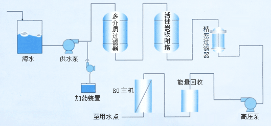 JHH-SW系列大中型海水淡化設備適用于海島、駐地及沿海缺水城市。能夠有效地去除海水中的無機鹽、重金屬離子、有機物細菌及病菌等有害成分,將海水淡化為符合國家生活飲用水標準的優質水。該套系統預處理系統采用全自動多路組合閥,實現全自動大流量反沖洗以及正洗全過程。該套系統的全新殼體,管路全部采用耐腐蝕材料,保證了全套系統的經久耐用。主機RO系統是采用了最先進的RO系統軟件和優質的膜元件,根據設備的產水量結合高效獨特的能量回收技術設計而成,保證了系統運行的低能耗。并配有先進的檢測監控系統,保證系統運行平穩,產水優質(當產水質量超過警戒鹽度值時,系統自動打開排泄閥門,將產水導入排廢水道)以及為系統的運行狀況提供準確的信息。整套系統的管路中配備了先進的流量、壓力等控制儀表和卸壓、排放管路,能夠保持整個管路系統運行平穩、安全,保證了系統維護安全,方便可靠。