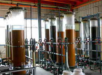 混床除鹽原理:原水首先進入無閥濾池進行預處理直流入過濾水槽,再通過過濾水泵送水至陽床上部,在床中與強酸陽樹脂接觸,樹脂將Ca2+、Mg2+、Na+、K+、等陽離子從水中置換到樹脂上,除去陽離子后的水從塔下流出并送入脫CO2塔上部,在塔內與塑料多面空心球接觸形成水膜, HCO3-很快分解成CO2和H2O,通過風機將CO2從塔頂吹除,從而大大減輕陰床的負荷。脫除CO2的水進入中間水池,中間水泵將水送入陰床,在床中與強堿陰樹脂接觸,樹脂將水中SO42-、Cl-、NO3-等陰離子置換到樹脂上,水中的陰離子被除去。經一級除鹽后的水再進入混床除去少量殘存陽、陰離子和SiO3,經混床處理制得合格的的除鹽水。
