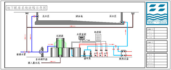 池水在重力作用下自流到設備,處理后的清水經水泵送到池中。水處理過程中,水泵在主機的后面。當水面的同層沒有空間設置機房時,可作水泵后吸式系統,即地下機房,但必須滿足機房地面低于池水面4.5米以上。機后泵系統的第一個設備是流量調節自動啟閉器(用作停電時自動關閉和電壓不穩時隨時自動調節流量),然后是主機、曝氣平衡吸水箱、水泵、換熱器和消毒設備。同時機房內需要設置集水坑和排污泵(排污量不宜過小)。此系統設備多于機前泵系統,投資也高于機前泵系統,地下機房陰暗潮濕,通風、排水不如機前泵系統方便。