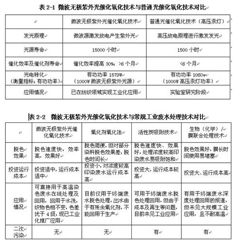 本項目的主要技術“微波無極紫外光催化氧化技術”屬原創性技術,國內外未見同類技術報道。與普通光催化氧化技術(高壓汞燈)相比,光源光電轉化效率提高50%,催化效率提高30%,對比見表2-1。與其他常規工業廢水處理技術對比,具備高溫適應性、投資運行成本合理,以及處理速度快、效率高,無二次污染等顯著優勢特點,非常適用于高溫紡織印染廢水的處理與回用,對比見表2-2: