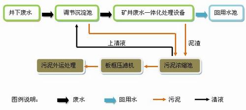 結合沃力環保在高懸浮物、酸性礦井污水的回用技術優點,為煤炭開采行業量身定做礦井廢水回用解決方案,具體工藝流程如下: