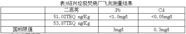 另外,尾氣凈化裝置收集下來的粉塵因重金屬、二惡英等含量較高而成為危險廢棄物,在采用機械爐排爐焚燒垃圾時,飛灰中二惡英濃度在600~6000 ng/Kg,占二惡英總量的90%以上,由于流化床焚燒爐焚燒時產生的飛灰量較大,故二惡英含量較爐排爐相對較低,但其占二惡英的部含量并沒有多大變化。因此收集下來的粉塵應進行無害化處理,哈爾濱垃圾焚燒廠采用水泥進行固化,而紹興垃圾焚燒廠則用來制磚,據報道制磚后測量結束表明各項指標均不超過相關標準限制,是值得推廣的辦法之一。表3為紹興垃圾焚燒廠飛灰測量結果。