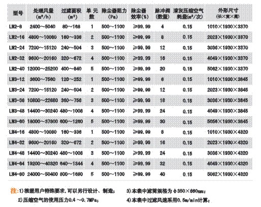 LW型系列濾筒式除塵器技術性能參數表