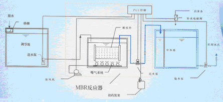 XGHY一體化生活污水回用系統采用先進、成熟的生物膜反應器為核心的處理設備。該反應器的生物填料有陽離子纖維經特殊工藝加工而成,理論表面積為12000M2/M3(填料),并且克服了常規軟性填料容易結團的弱點。因此,反應器內有很高的生物濃度(VSS可達30q/1)和較大的容積負荷(C0D10~40KG/M3·d)。生物膜反應器兼并有一定的過濾功能在水處理工藝中可以不設二沉池,縮小了建筑面積和減少了工程投資。二、工藝流程