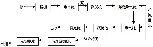 污水處理工藝流程見上圖。考慮生活廢水中含有大量懸浮物,在進入生化池的先經“格柵”“微濾機”,去除大部分懸浮物(SS),減少不易降解的懸浮物(SS)的數量,降低后續工藝的壓力。