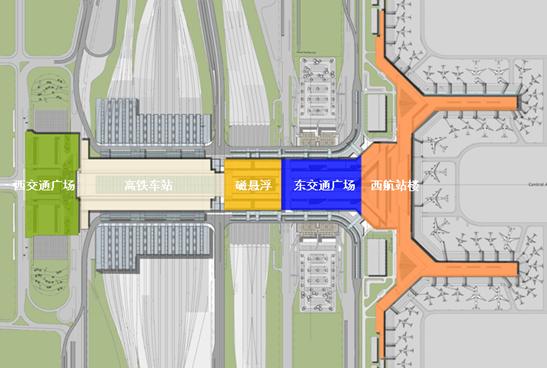 上海虹橋綜合交通樞紐建筑綜合體由東至西分別是虹橋機場西航站樓、東交通廣場、磁懸浮、高鐵、西交通廣場等。上海虹橋綜合交通樞紐國際機場西航站樓由航站主樓、登機長廊組成。總建筑面積30余萬平方米。虹橋機場西航站樓規劃的目標是在近期滿足年旅客吞吐量2100萬人次,并預留未來發展到3000萬人次的能力。