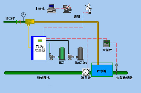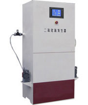 發生器由供料系統、反應系統、吸收系統、安全系統以及設備自動控制系統組成,發生器外殼為PVC材料。運行時氯酸鹽水溶液與鹽酸在負壓條件下,經供料系統定量輸送到反應系統中,在一定的溫度下經過負壓曝氣反應產生二氧化氯與氯氣的復合氣體,經吸收系統吸收后,形成一定濃度的二氧化氯復合消毒液,然后通入待處理水中。