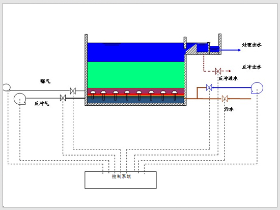 可密切監測濾池的運行狀態,根據出水水質的情況、BAF池的液位、進水泵壓力的變化確定反沖的周期和時間(氣沖、氣水聯合反沖、水漂洗),實現濾池的自動反沖洗。