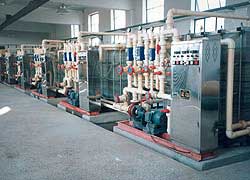 原水→活性炭過濾器→精密過濾器→電滲析裝置→陽離子交換器→陰離子交換器→混合離子交換器→多效蒸餾水機→成品水