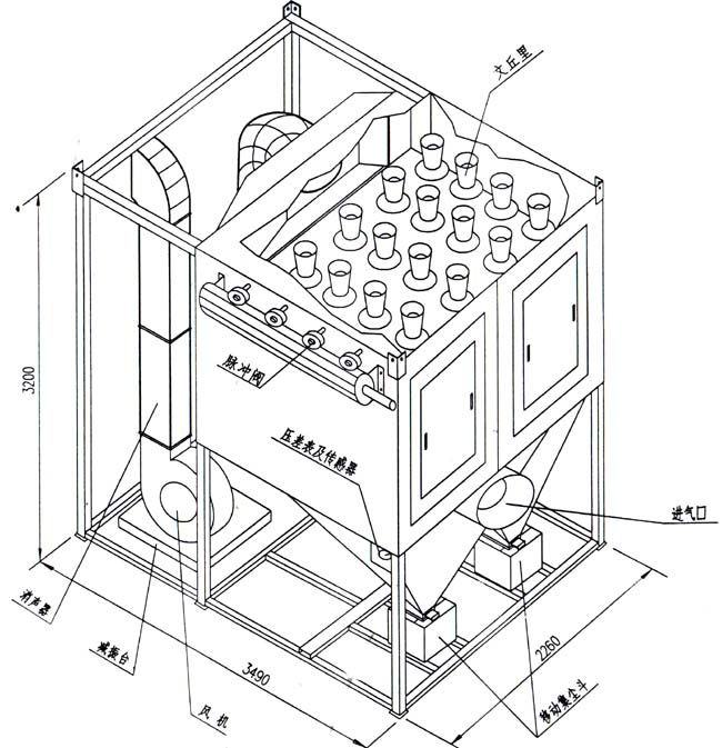 本除塵器為負壓運行,含塵氣體由耐磨進風口進入除塵器下箱體后,氣流橫斷面積突然擴大,流速降低,其粒度、密度較大的塵粒在阻擋及重力作用下不斷沉降,粒度、密度較小的輕微粉塵,浮動時被聚酯纖維濾筒篩濾阻留,凈化空氣則透過濾篩進入土箱體凈氣室,然后經出氣口由風扇排出。隨著積附在濾筒外壁的粉塵不斷增加,濾筒內外壁壓也隨著上升,塵粒在阻擋及重力作用下不斷沉降,粉塵被捕集于濾筒外表面,潔凈氣體則經濾筒中心進入清浩氣室,經出風口排出。當濾筒表面捕集的粉塵達到一定數量時,濾筒的阻力也隨之達到某一定值,當壓差到設定值時,控制閥將自動打開,壓縮空氣經脈沖閥及噴嘴向文丘里管進行脈沖反吹,并直接射入濾筒中心,把捕集于濾筒表面的粉塵吹凈,粉塵在重力作用下,隨著氣流下沉于集塵斗中。