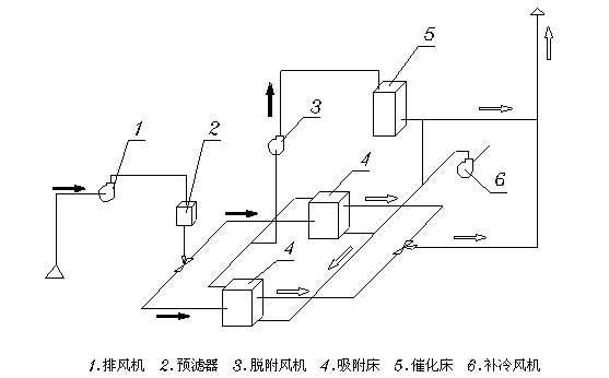 本裝置根據吸附(效率高)和催化燃燒(節能)兩個基本原理設計,采用雙氣路連續工作,一個催化燃燒室,兩個吸附床交替使用。先將有機廢氣用活性炭吸附,當快達到飽和時停止吸附,然后用熱氣流將有機物從活性炭上脫附下來使活性炭再生;脫附下來的有機物已被濃縮(濃度較原來提高幾十倍)并送往催化燃燒室催化燃燒成二氧化碳及水蒸氣排出。當有機廢氣的濃度達到2000PPm以上時,有機廢氣在催化床可維持自燃,不用外加熱。燃燒后的尾氣一部分排入大氣,大部分被送往吸附床,用于活性炭再生。這樣可滿足燃燒和吸附所需的熱能,達到節能的目的。再生后的可進入下次吸附;在脫附時,凈化操作可用另一個吸附床進行,既適合于連續操作,也適合于間斷操作。