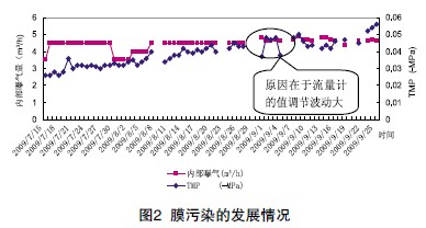 從圖 2 可以看出:1)在內部曝氣量為3.5~4.5m3/h時,TMP相對穩定,發展緩慢。7月15日~9月15日,膜系統的跨膜壓差TMP緩慢上升至56kPa,從未進行化學清洗。說明膜本身具有較強的抗污染性;2)恒流量運行相對于恒壓運行更有助于減緩膜污染趨勢;3)在設計的參數下運行,膜系統可以保持較長時間的穩定性。