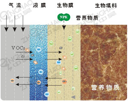 在適宜的條件下,臭氣(工業廢氣)經過生物填料層,附著生長在生物填料上微生物通過代謝活動將廢氣中的污染物轉化為簡單的無機物(如CO2、H2O、SO42-、NO3-等)及細胞組成物質。在此過程中微生物對VOCs進行氧化分解和同化合成,代謝產物一部分溶于液相,一部分作為細胞物質或細胞代謝能源,還有一部分(如CO2)則從液相轉移到氣相。廢氣中污染物通過上述過程不斷減少,從而得到凈化。