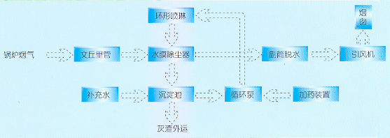含塵及二氧化硫的煙氣,高速進入高效脫硫花崗巖水膜除塵器內,同時將 PH 值在 10 以上的堿性水噴入筒體內,在引風抽力下高速運轉,竟熱態煙氣濕潤、凝聚,其中二氧化硫與堿性水霧進行化學反應,使含塵顆粒凝聚、濕潤、比重加大,在筒內以切線進入產生離心力,將凝聚的煙塵從煙氣中分離出來,再由筒中的噴淋水沖洗到筒體底部水槽內經水浴后,進入沉淀池沉淀,廢水經沉淀后再用耐酸泵打入除塵內循環使用,不產生二次污染,并達到脫硫除塵目的。