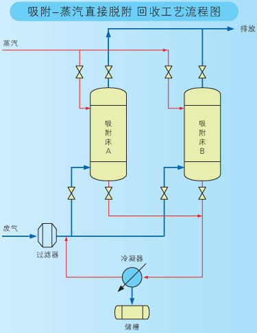 吸附床吸附飽和后,并將脫附出來的有機氣體攜帶出吸附床,蒸汽進入吸附床內,對流活性炭進行間接加熱,同時真空泵對吸附床進行抽真空。吸咐床出來的氣體經冷凝后,液體進入貯槽,不凝氣回流至吸附床進一步吸附。