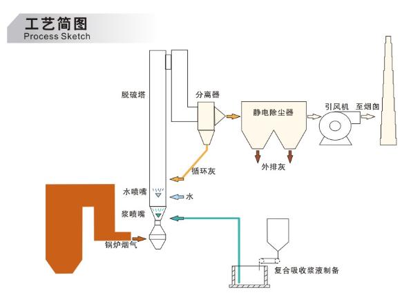 來自鍋爐空氣預熱器尾部的煙氣流經CFB吸收塔,將煙塵和消石灰粉流化攜帶,在塔內形成高粉塵濃度的吸收區,同時在塔底噴水減溫增濕,以加速SO2與消石灰的反應。煙氣攜帶的粉塵經除塵后,一部分返回吸收塔繼續參加反應,從而將煙氣凈化,本方法可保證85%以上的脫硫率。