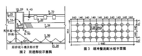 改進措施(見圖2):①在斜管沉淀池進水過渡段增設緩沖整流配水板,單塊配水板板厚為10cm,其平面尺寸見圖3;②在兩小格單池間增加隔板,從池底一直隔到池頂;③于進水處底部增裝斜板,三角形區可用混凝土填實;④取消沉淀池第一格排泥斗槽;⑤取消第一格穿孔排泥管。