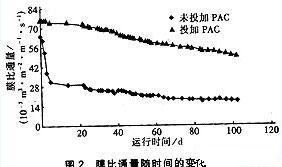 ②在中試中,向反應器內投加PAC可降低膜內、外COD濃度之差,形成體積更大、粘 性更小、強度更高的污泥絮體,并在膜表面形成更加疏松的泥餅層,大大改善了污泥的可過 濾性,提高了膜通量。
