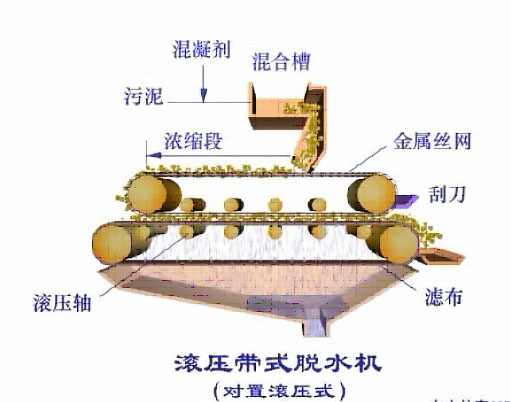 污泥脫水是依靠過濾介質(多孔性物質)兩面的壓力差作為推動力,使水分強制通過過濾介質,固體顆粒被截留在介質上,以達到脫水的目的。