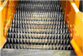 篩盤的布置方式使得進入的物料可以充分旋轉并完全分散,同時物料還有向上的運動。圓盤的這種設計使得向上運動的能量用于分離過程。很短的篩面就可有較大的產量。像傳統的設備,用間隔套管來保持篩盤之間的距離,這里用的是雙錐體系統專利技術。如果垃圾中有長萡或者錄像帶等纏繞在錐系上,會在錐的細端脫落,并被相對軸上的篩盤扯碎。這是由雙錐體系統的旋轉和設計來實現的。