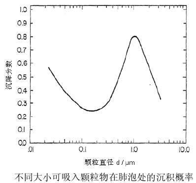 可吸入顆粒物的產生分為自然源和人為源,人為源主要來自煤的燃燒、機動車排放和一些工業生產過程。有研究結果表明,空氣動力學尺度大于10 um的顆粒物,基本上被阻止于人的鼻腔;2 um -10 um的顆粒,可進入人體咽喉,約90 %可進入并沉積于呼吸道的各個部位,10%可以到達肺的深處,并沉積于肺中;小于2 um的顆粒,100 %可以吸入肺泡中,其中0.3 um-2 um的粒子幾乎全部沉積于肺部而不能呼出,進而進入人體血液循環。圖中給出了可吸入顆粒物在人體肺泡處沉積比例,可見對人體危害最大的顆粒主要集中在1微米尺寸附近,而這尺寸段的顆粒卻是最難清除的。