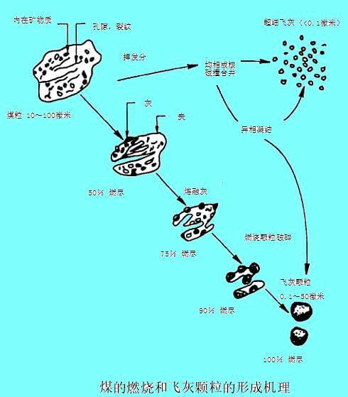 圖示意地說明了燃煤飛灰細顆粒的形成過程,加熱開始后,煤顆粒先是揮發份脫除和燃燒,然后是碳的燃燒。對于大多數粉煤顆粒,因為迅速加熱,顆粒產生塑性并膨脹,形成中空的球形顆粒,隨著碳的燃燒,灰分雜質將熔融在一起,當90%的碳燃盡時,變脆的碳結構發生了破裂,產生了大小不一的以微米級粒徑為主的飛灰顆粒。亞微米顆粒主要是山于灰的揮發,如強堿金屬鹽和重金屬,以及揮發分的燃燒產物經歷的均相凝結過程以及在己有顆粒上的非均相凝結過程形成。
