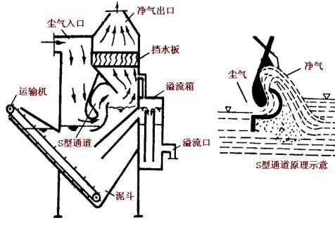 圖5-5-2是沖激式除塵器的示意圖,含塵氣體進入除塵器后轉彎向下,沖激在液面上,部分粗大的塵粒直接沉降在泥漿斗內。隨后含塵氣體高速通過S型通道,激起大量水滴,使粉塵與水滴充分接觸。在正常情況下,除塵器阻力為1500Pa左右,對5μm的粉塵,效率為93%。沖激式除塵器下部裝有刮板運輸機自動刮泥,也可以人工定期排放。