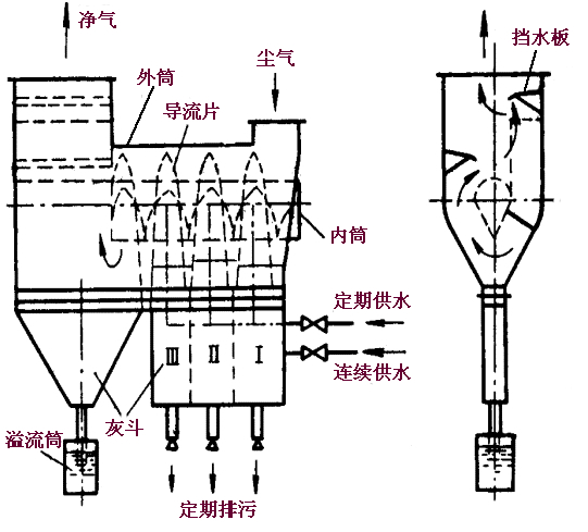 脫水器可以設于除塵器內部(在氣流出口處),也可與除塵器分開成為單獨的設備。目前國內定型設計的濕式除塵器都設有氣液分離裝置。試驗表明,只要除塵器的實際處理風量在規定的設計范圍以內,一般不會發生“帶水”現象,發生“帶水”大都是由于選用風機過大引起的。