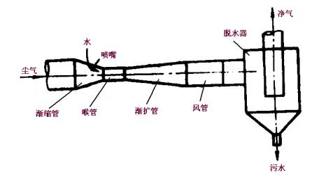 含塵氣流由風管1進入漸縮管2,氣流速度逐漸增加,靜壓降低。在喉管3中,氣流速度達到最高。由于高速氣流的沖擊,使噴嘴7噴出的水滴進一步霧化。在喉管中氣液兩相充分混合,塵粒與水滴不斷碰撞凝并,成為更大的顆粒。在漸擴管4氣流速度逐漸降低,靜壓增高。最后含塵氣流經風管5進入脫水器6。由于細顆粒凝并增大,在一般的脫水器中就可以將粒塵和水滴一起除下。