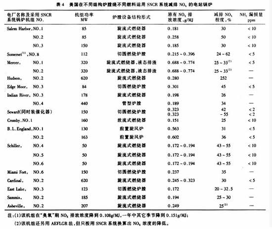 表4示出美國不同型爐燒不同燃料鍋爐應用SNCR系統匯總。
