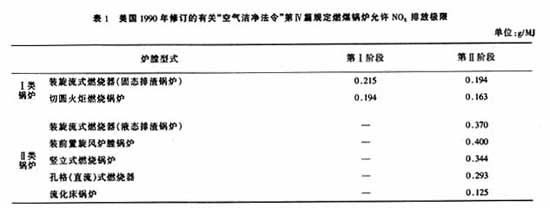 美國制定了全國執行的允許向大氣排放限量法令。當今,美國電力行業執行1990年修訂的“空氣潔凈法”第Ⅳ篇的燃煤鍋爐允許NOX排放標準。全美實施第Ⅰ階段(1996年至2000年)及第Ⅱ階段(2000年以后)的要求如表1所示。