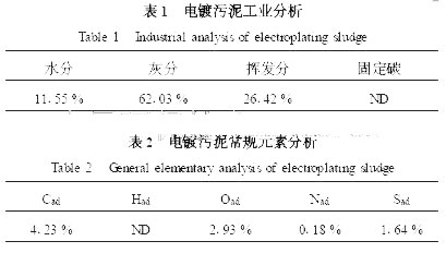 2.1 電鍍污泥的工業分析與元素分析結果試驗所用物料來自杭州某工業廢物處理有限公司. 試驗前,首先對原始電鍍污泥進行工業分析與元素分析,分析結果分別見表1、表2 和表3. 由表1、表2 可知,原始電鍍污泥的水分、灰分都相當高,其中,原始電鍍污泥樣品中水分占總重的50 %以上. 由表3 可知,電鍍污泥內除含有Cr 、Zn、Cu、Pb、Ni 、Hg 等重金屬外,還有諸多Fe , Na , Mg , K, Ca 等元素. 其中的重金屬來自電鍍廢水,其它元素則是在處理電鍍廢水時,由加入的次氯酸鈉、硫化鈉、硫酸亞鐵或氫氧化鈣等化學藥劑產生的(Jakob et al . , 1995) ,可見電鍍污泥不光金屬元素含量高,且成分相當復雜.
