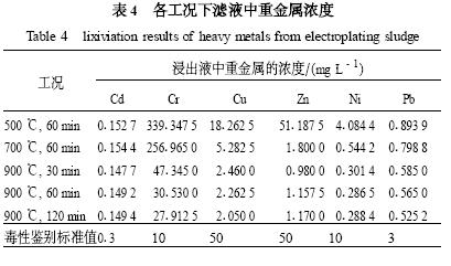 本文對不同氣氛情況下不同工況電鍍污泥在管式爐內的焚燒灰渣作了進一步探討,研究了溫度和焚燒時間對電鍍污泥中重金屬的浸出特性的影響.表4 是對5 種工況下的焚燒灰渣的浸出液的測定結果,浸出液中Cd、Cu、Ni 、Pb 的濃度都明顯低于國家浸出毒性鑒別標準值.