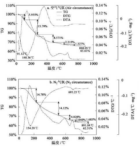 熱重分析試驗使用美國TA 公司SDTQ600 綜合熱分析儀器,分辨率為01001 mg , N2 氣氛下爐溫最高可達1 200 ℃,而在空氣氣氛下最高可達1 000 ℃.