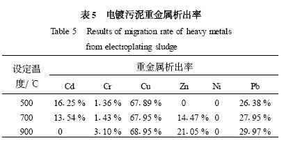 由表5 可知,在6 種重金屬元素中,Ni 在各種試驗工況下都沒有析出,是唯一沒有檢出的重金屬,Cr的析出率雖然隨著焚燒時間的增加而略有提高,但總的來說Cr 的析出量還是相當低的,這說明這2 種重金屬是典型的不揮發性重金屬. 由于Cr6 + 的劇毒性,這一現象尤其要引起人們對電鍍污泥焚燒灰渣的重視. Zn、Cu 和Pb 的析出率變化規律比較接近,析出率隨著溫度的增高而增大. Zn 在500 ℃時析出率計算值為0 ,在溫度超過700 ℃之后析出率有所增加,說明Zn 的開始析出溫度范圍為500~700 ℃之間,這種規律也與Zn 元素在電鍍污泥的不同結合狀態有關. Cd 是6 種元素中析出率最特殊的一種,Cd元素在500 ℃焚燒時的析出率最高為16125 % ,而隨著溫度升高,析出率呈減小趨勢,在900 ℃時已經為零,這是因為Cd 屬于半揮發性元素,當反應溫度升高后,Cd 與電鍍污泥內的某些元素發生反應,例如S 和Cl 等,生成新的化合物,反而不易揮發,更容易富集在渣中.