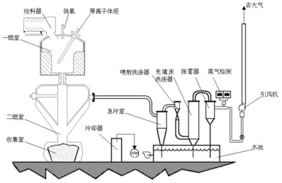 ![]() 1-廢物進料;2-豎爐;3-熔爐;4-融渣收集;5-等離子體炬;6-門;7-尾氣出口 |