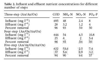 三步操作為an (1 h),ax (1.5 h), ox (4 h)及0.5 h的閑置時間,總的操作時間為7 h。四步操作為an (1 .5h) ,ox (4 h),ax (1.5 h),ox (2 h)及0.5 h的閑置時間,總的操作時間為10.5h。五步操作為An/Ax/Ox/An/Ox其水利停留時間分別為為1/1.5/4/1.5/2 h 及0.5 h的閑置時間,總的操作時間為9 h。污泥停留時間保持在10天。每個實驗條件運行兩次。運行第一次為了適應環境,第二次為了得到實驗數據。