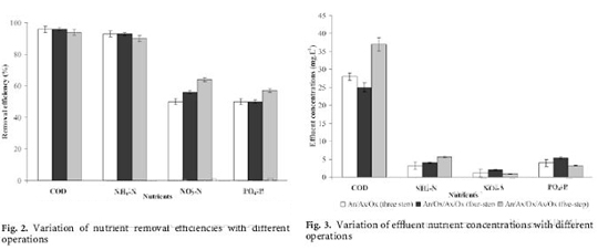 培養基中是含有NH4-N作為氮源。但是在好氧階段NH4-N的硝化作用產生了NO3-N。因此,在最后的出水中,NH4-N和NO3-N非常重要。圖2說明了在同的循環過程中三步、四步和五步操作中的去除效果。NH4-N去除率在90% 和92%之間。其中三步操作去除率接近92%,表明NH4-N的去除是最好的,因為7h的較低操作時間。