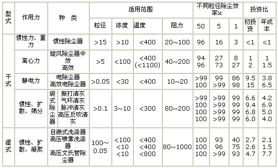 在日常工業上用于粉塵顆粒物分離的設備主要有:重力沉降式除塵器、慣性除塵器、電除塵器、濕式除塵器、過濾式除塵器、旋風除塵器,簡述如下[1,2,3]: